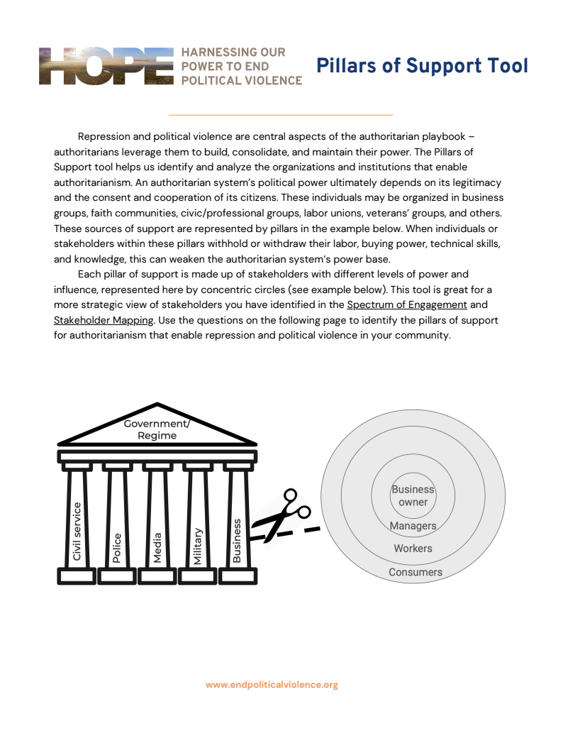 Repression and political violence are central aspects of the authoritarian playbook – authoritarians leverage them to build, consolidate, and maintain their power. The Pillars of Support tool helps us identify and analyze the organizations and institutions that enable authoritarianism. An authoritarian system’s political power ultimately depends on its legitimacy and the consent and cooperation of its citizens. These individuals may be organized in business groups, faith communities, civic/professional groups, labor unions, veterans’ groups, and others. These sources of support are represented by pillars in the example below. When individuals or stakeholders within these pillars withhold or withdraw their labor, buying power, technical skills, and knowledge, this can weaken the authoritarian system’s power base.