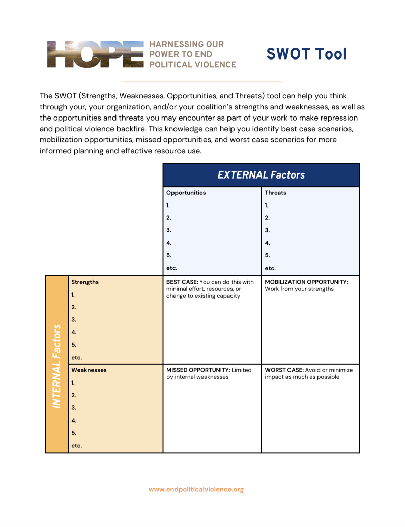 The SWOT (Strengths, Weaknesses, Opportunities, and Threats) tool can help you think through your, your organization, and/or your coalition’s strengths and weaknesses, as well as the opportunities and threats you may encounter as part of your work to make repression and political violence backfire. This knowledge can help you identify best case scenarios, mobilization opportunities, missed opportunities, and worst case scenarios for more informed planning and effective resource use.