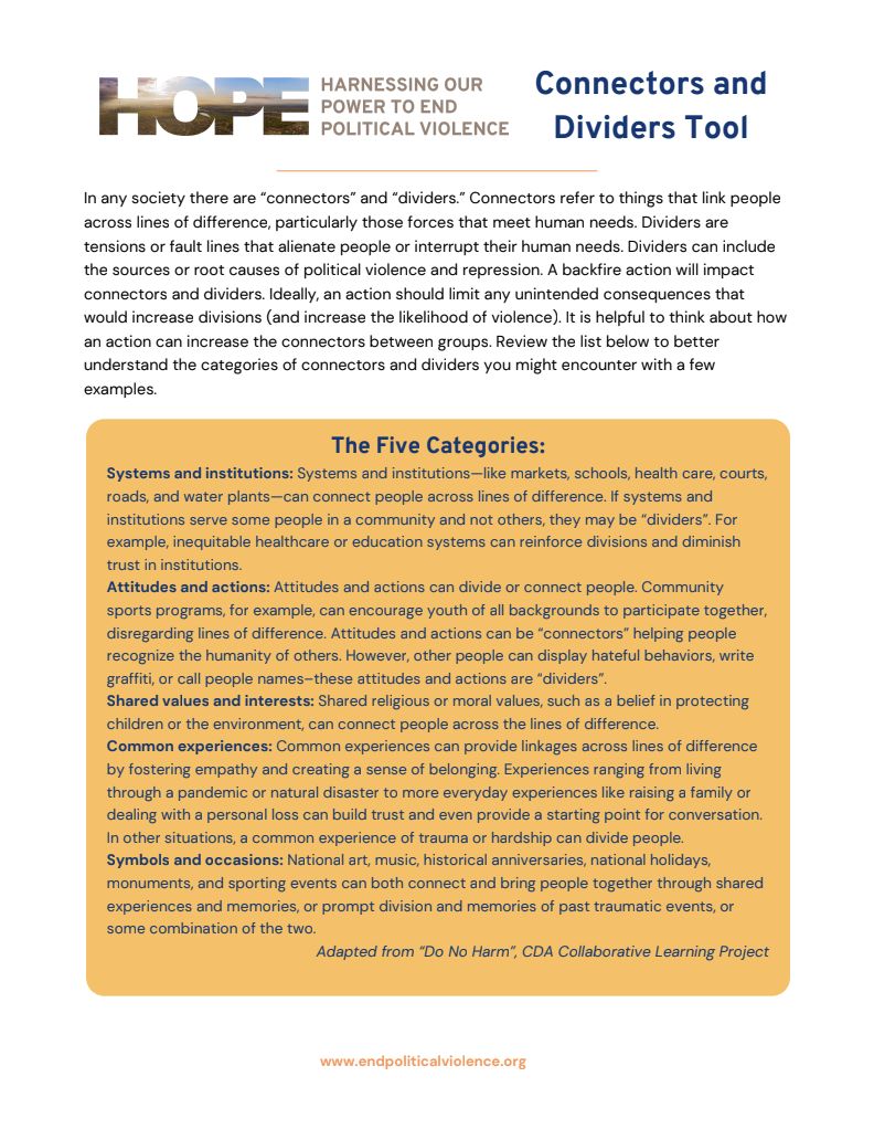 In any society there are “connectors” and “dividers.” Connectors refer to things that link people across lines of difference, particularly those forces that meet human needs. Dividers are tensions or fault lines that alienate people or interrupt their human needs. Dividers can include the sources or root causes of political violence and repression. A backfire action will impact connectors and dividers. Ideally, an action should limit any unintended consequences that would increase divisions (and increase the likelihood of violence). It is helpful to think about how an action can increase the connectors between groups.
