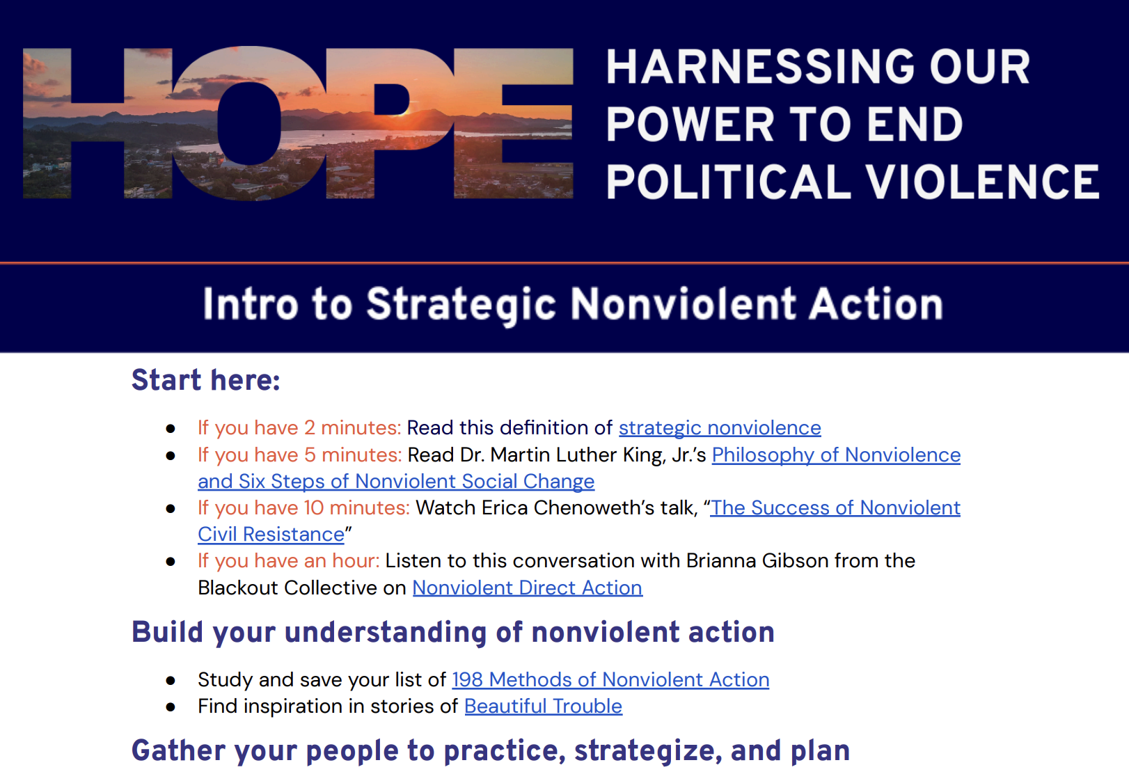 Develop skills and strategies to make political violence backfire and grow our power to end political violence.